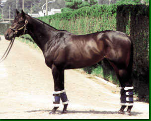 バランスの良さから伝わってくるものであろうか、大型馬でも重苦しさはまるでない。ゆったりとした造りだし、胴体の長さからは距離に対してかなりの融通性があるはずだ。テカテカに黒光りする体は見るからに状態が良さそう。 |
