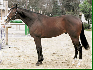 | 頭が小さく見えるほどに太い首。これを難なく受け入れる前躯。腹構えは薄からず、ぶ厚からず。キリッと引き締まったひ腹。頭の位置からトモに至るまで、見事なスロープを描き、最高の張りを誇っている。皮膚が薄く、肌艶もベスト。 |