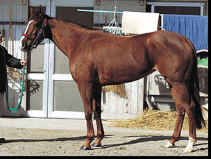 中間の坂路での動きは素晴らしいが、この写真ではまだ全体に重い。冬場のせいか、毛ヅヤもいつもに比べると今イチ。姿勢に硬さはないし、筋肉そのものははち切れんばかりだが、取り立てて良くも悪くもない感じ。