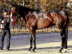 洗った直後で肌艶にムラはあるが、尾毛が長く非常に安定した横姿。腹回りに若干の余裕があるが、骨量からすれば9日時点ではこの腹でちょうどいい。ただ、うるさいタイプで府中までの輸送が鍵に。