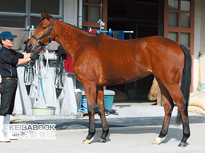 骨格がコンパクトで四肢も短め。母系の特徴が濃く出ており、いずれは1400mまでかもしれない。ただ、3歳限定ならマイルもこなすか。まだ絞れそうだが、筋肉量はこの時期にしては豊富。