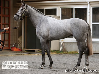 首位置が高いのは毎回のことだが、今回は前走時より腹回りが締まって、後躯がしっかり見える。心肺が強くスタミナ豊富で落ち着きがある表情がいい。芦毛ながら皮膚に張りもある。