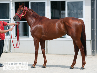 父の産駒らしく胴は長目で重心も高いが、首が短いあたりを見ると1800mまでがベター。肩周辺の筋肉が発達して胸が深く、全体的な張りも良好。肌艶も冴えて体調は良さそう。好ムード。
